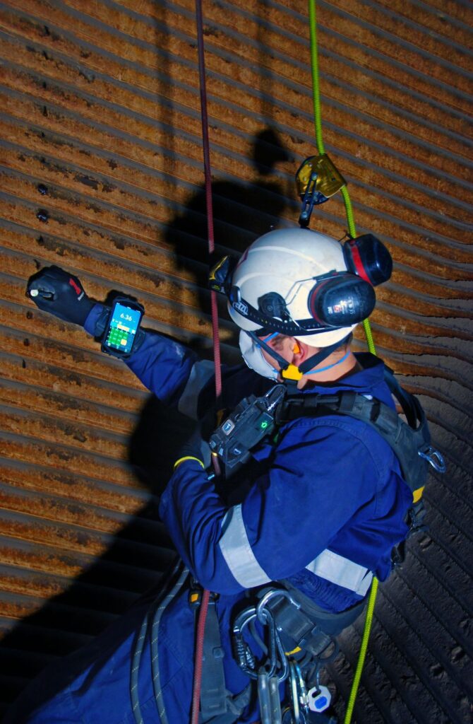 • Rope access: The unit fits discreetly in a pocket, with only a short probe cable exposed. The app can be worn on the wrist, freeing inspectors’ hands. Data can be sent instantly to the office without leaving position.
